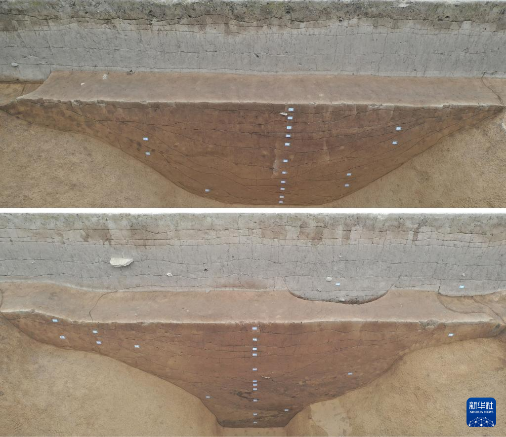 甘肅臨洮縣寺洼遺址南段東側“圍壕”解剖溝西壁剖面(上為外圈,下為中圈)(資料照片)。