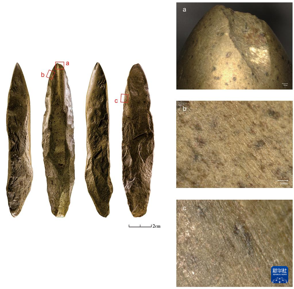 吉林和龍市大洞舊石器時代遺址第二階段出土的局部磨光石器(左)及其微痕特征(拼版照片,資料照片)。