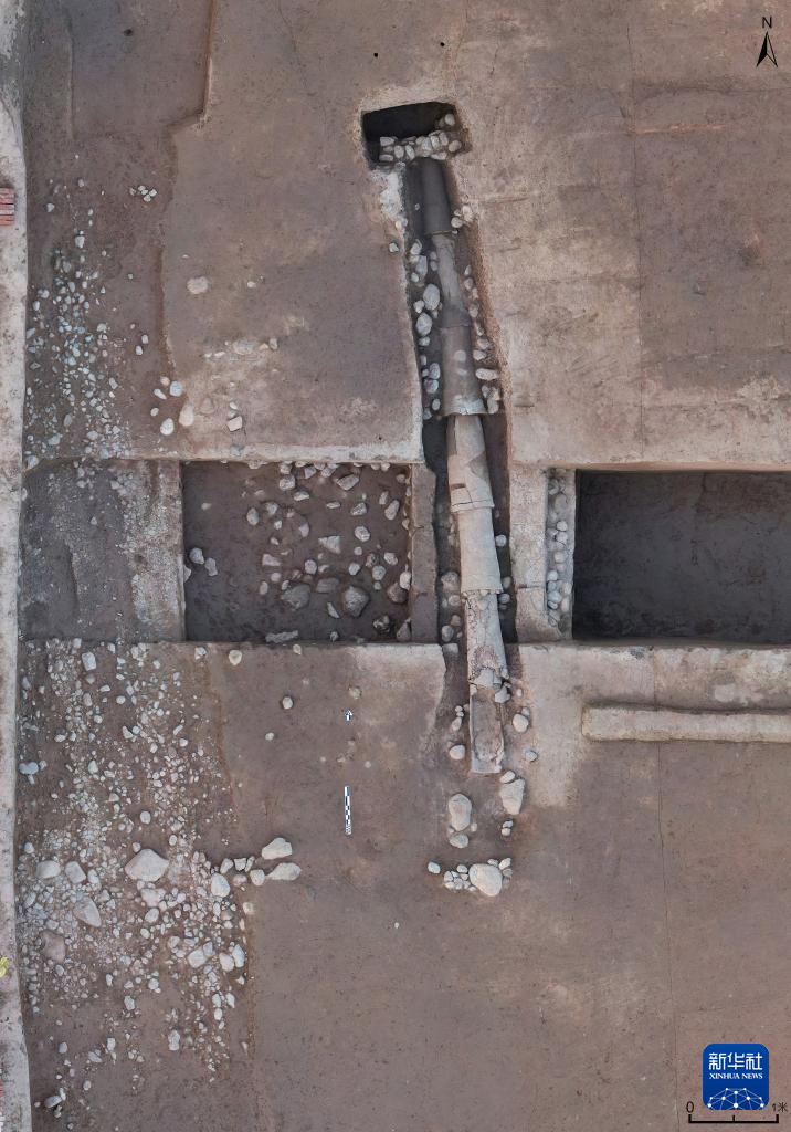 陜西寶雞市周原遺址宮城西北角鋪石道路及陶排水管道(資料照片)。