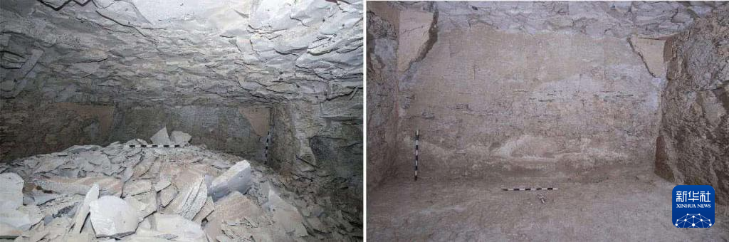 這張拼接的圖像顯示的是圖特摩斯二世法老陵墓一墓室清理前后的景象。