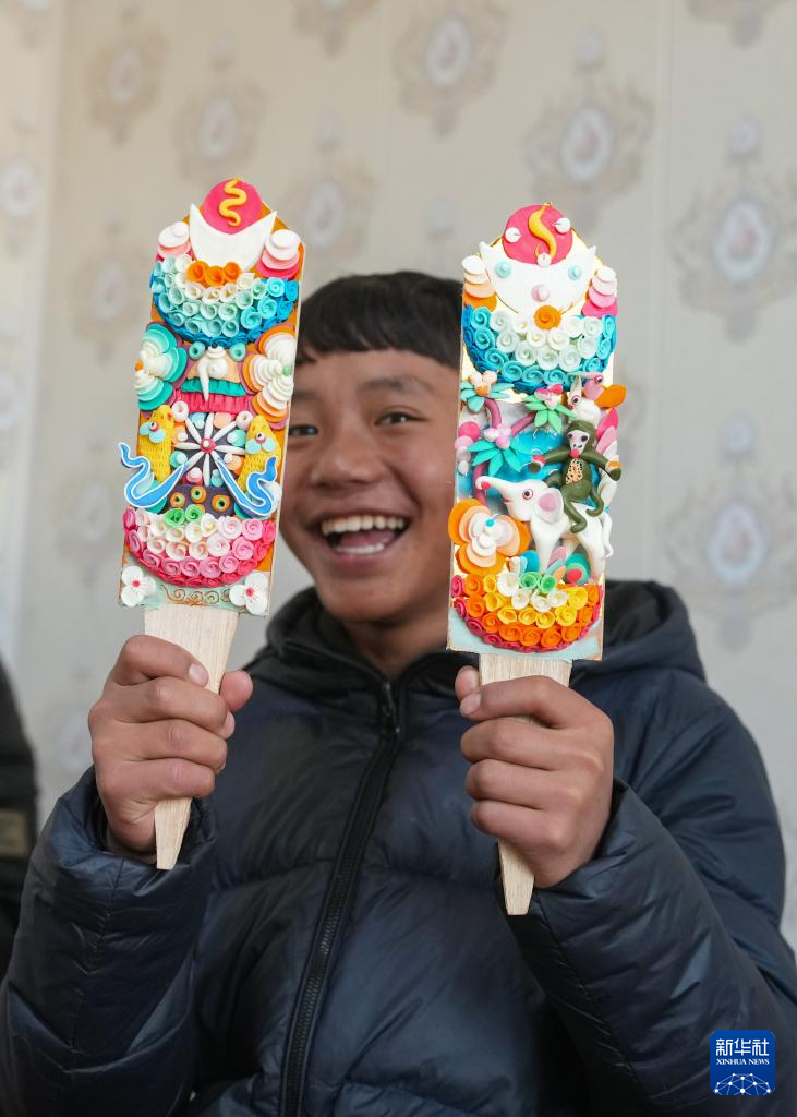 在拉薩市老城區,小學徒在展示剛剛做好的一對酥油花(2月25日攝)。