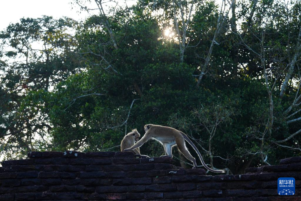 這是2月21日在斯里蘭卡阿努拉達普拉拍攝的嬉戲的猴子。