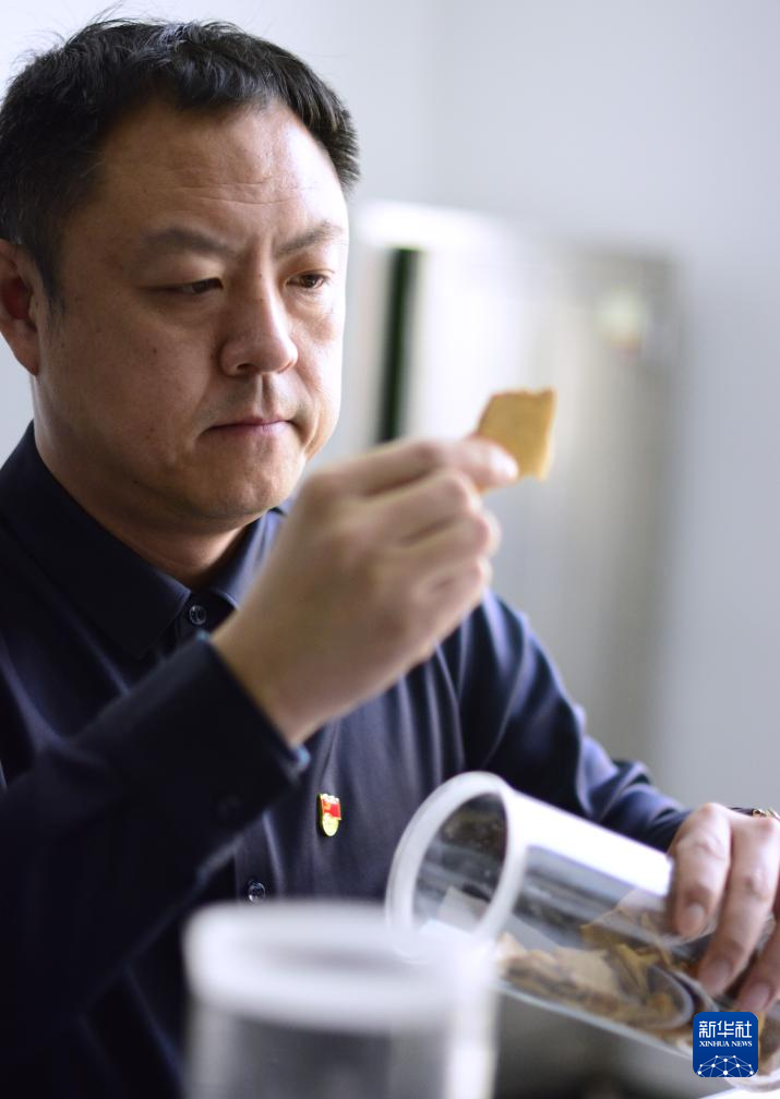 2月23日,同仁堂股份有限公司藥材鑒別首席技師郭朝暉在檢驗中藥材原材料。