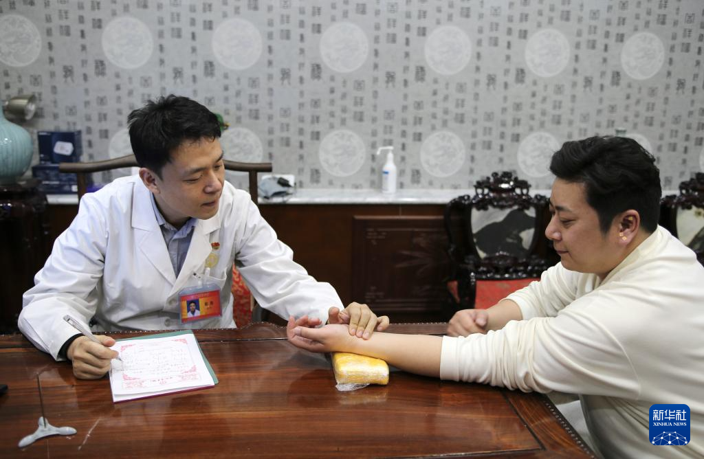 2月25日,中醫專家郝鵬(左)在位于北京前門大柵欄商業區的同仁堂醫館為患者把脈。