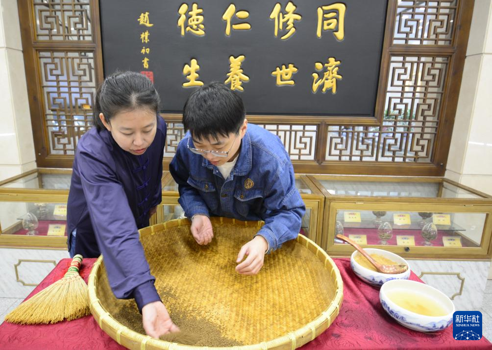 2月25日,北京同仁堂科技發展股份有限公司亦莊分廠技師李寧(左)在給徒弟傳授手工搖制西黃丸技藝。1980年出生于北京的李寧,從小對中醫藥產生濃厚的興趣,1999年進入了同仁堂從事中藥泛丸的制作工作。