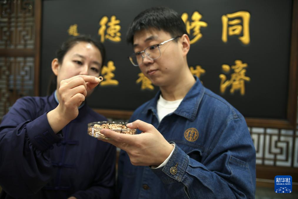 2月25日,北京同仁堂科技發展股份有限公司亦莊分廠技師李寧(左)在給徒弟傳授中藥選材知識。1980年出生的李寧,從小對中醫藥產生濃厚的興趣,1999年進入了同仁堂從事中藥泛丸的制作工作。由于同仁堂西黃丸靠傳統手工制作無法滿足市場需求,李寧帶領團隊將傳統制藥技藝與現代化制藥設備相結合,大幅度提升了西黃丸的成品率和產能。2015年,以李寧名字命名的首席技師工作室掛牌成立,李寧也帶起了徒弟。