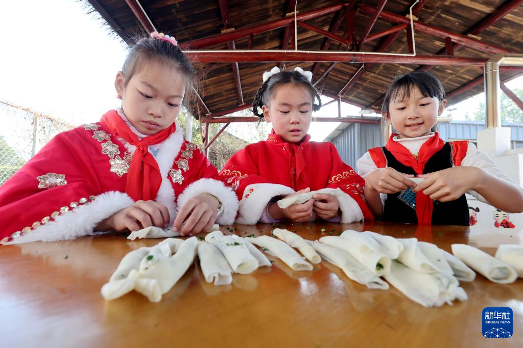 2月28日,浙江省湖州市德清縣干山小學的學生在制作春卷。