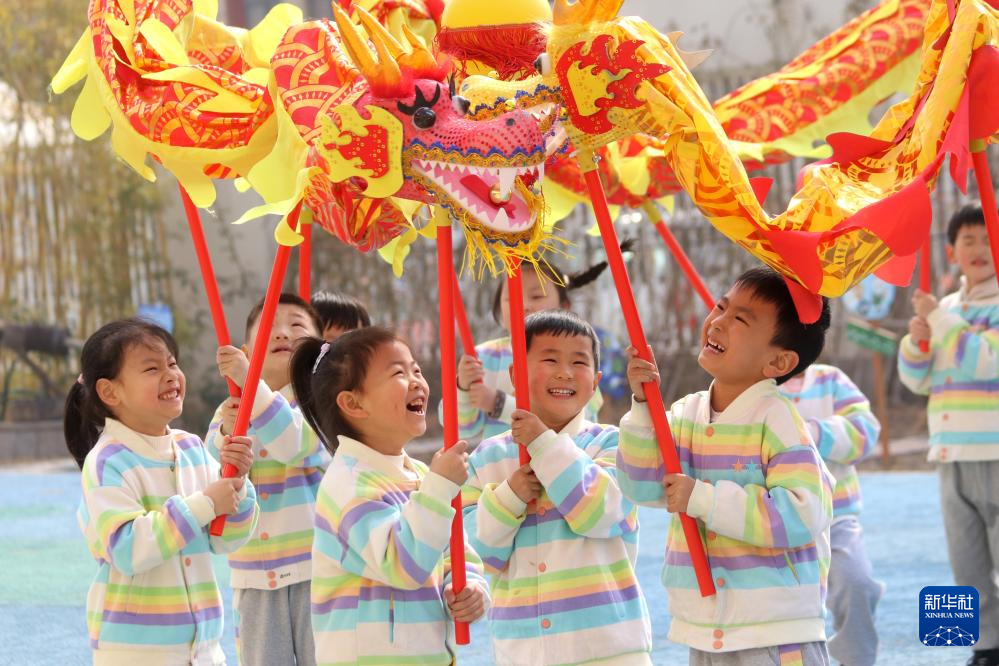 2月28日,山東濰坊高密市鳳鳴實驗幼兒園的小朋友們體驗舞龍。