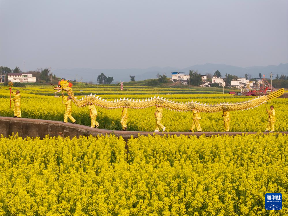 2月28日,在四川省瀘州市瀘縣全國重點文物保護單位龍腦橋景區,一支雨壇彩龍隊在瀘縣現代農業產業園譚壩核心區油菜花田里表演。雨壇彩龍被列入第一批國家級非物質文化遺產名錄。