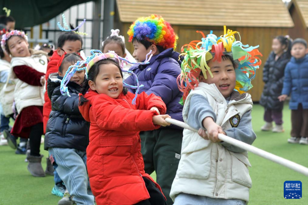 2月28日,山東省青島市寶城幼兒園的小朋友們進行“拔龍須”比賽。