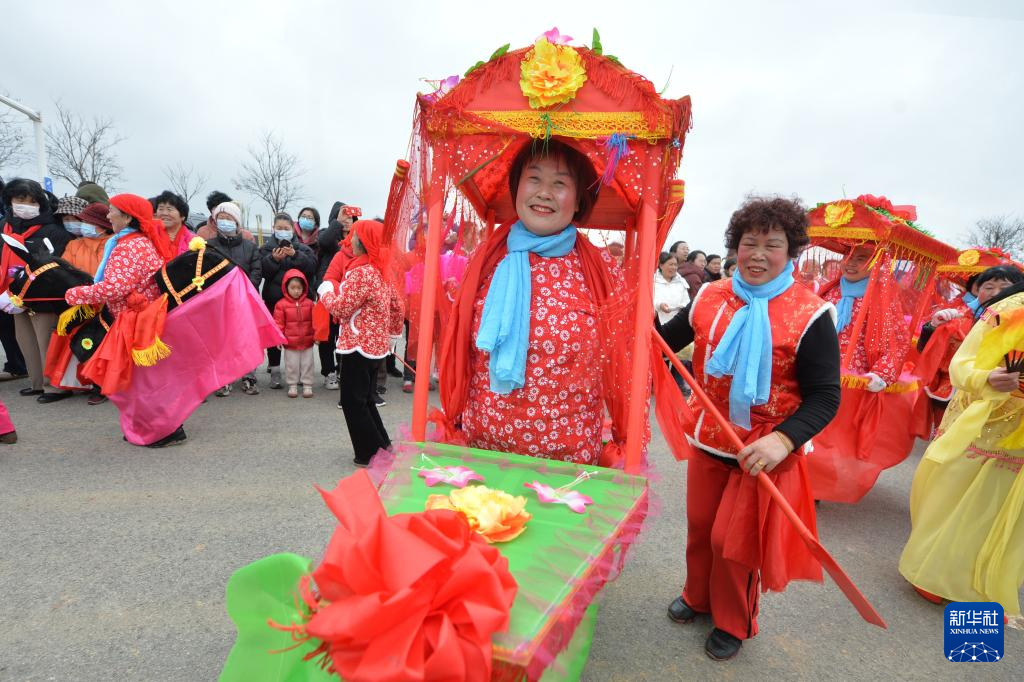 3月1日,居民在山東省青島市城陽區紅島街道高家社區表演“劃旱船”。