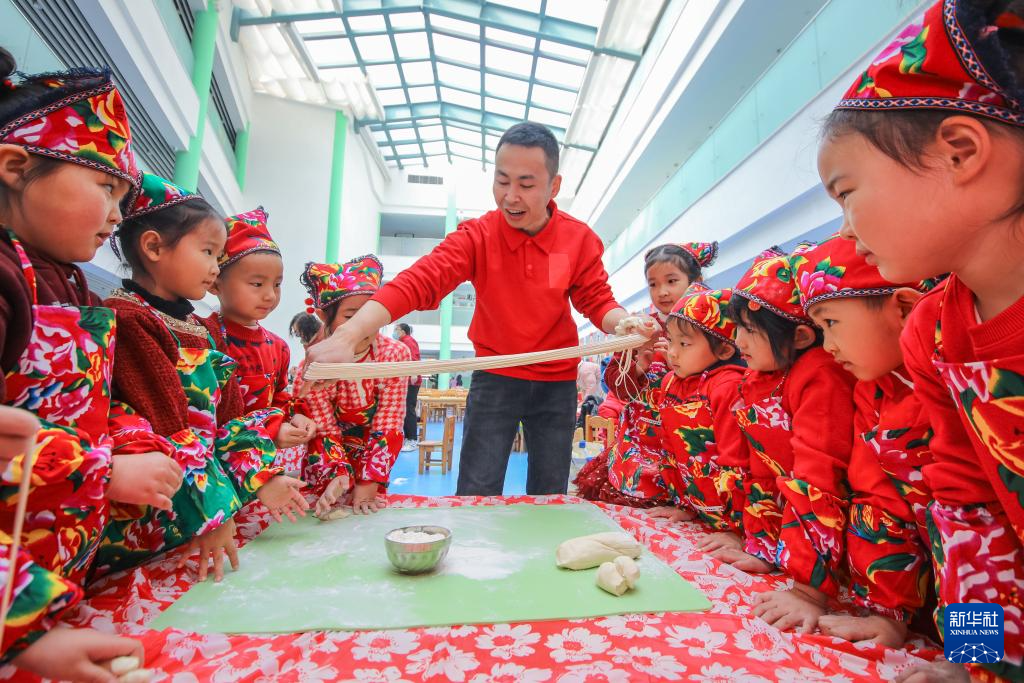 2月28日,在山東省青島市李滄區衡水路幼兒園開展的“二月二,龍抬頭”民俗活動中,面點師為孩子們展示制作龍須面。