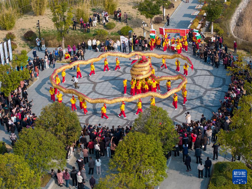 3月1日,在浙江省湖州市吳興區八里店鎮潞村舉行的“二月二龍抬頭”傳統文化活動上,人們表演具有當地特色的“稻穗龍舞”。