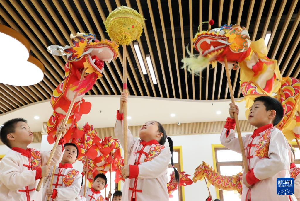 2月28日,在山東省濱州市博興縣一幼兒園,小朋友體驗傳統舞龍。