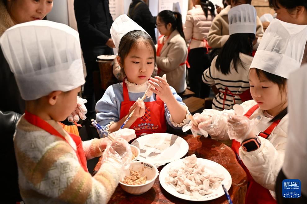3月8日,在福州三坊七巷同利肉燕非遺文化體驗館內,小朋友在包肉燕。