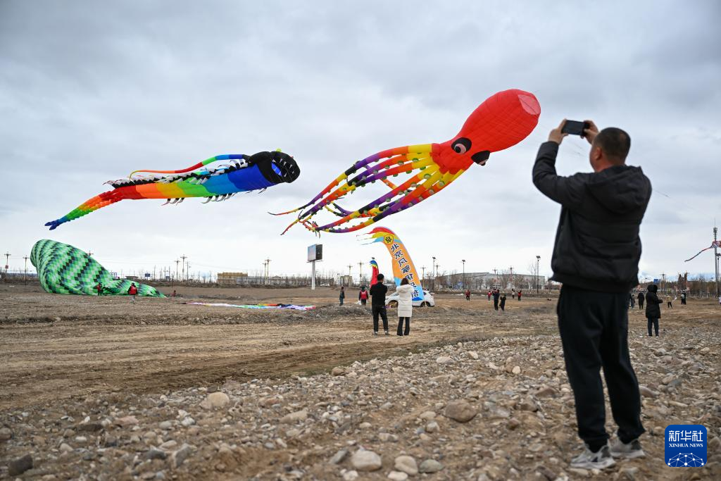 3月8日,在新疆都拉塔口岸房車露營基地,當地群眾拍攝放飛的風箏。