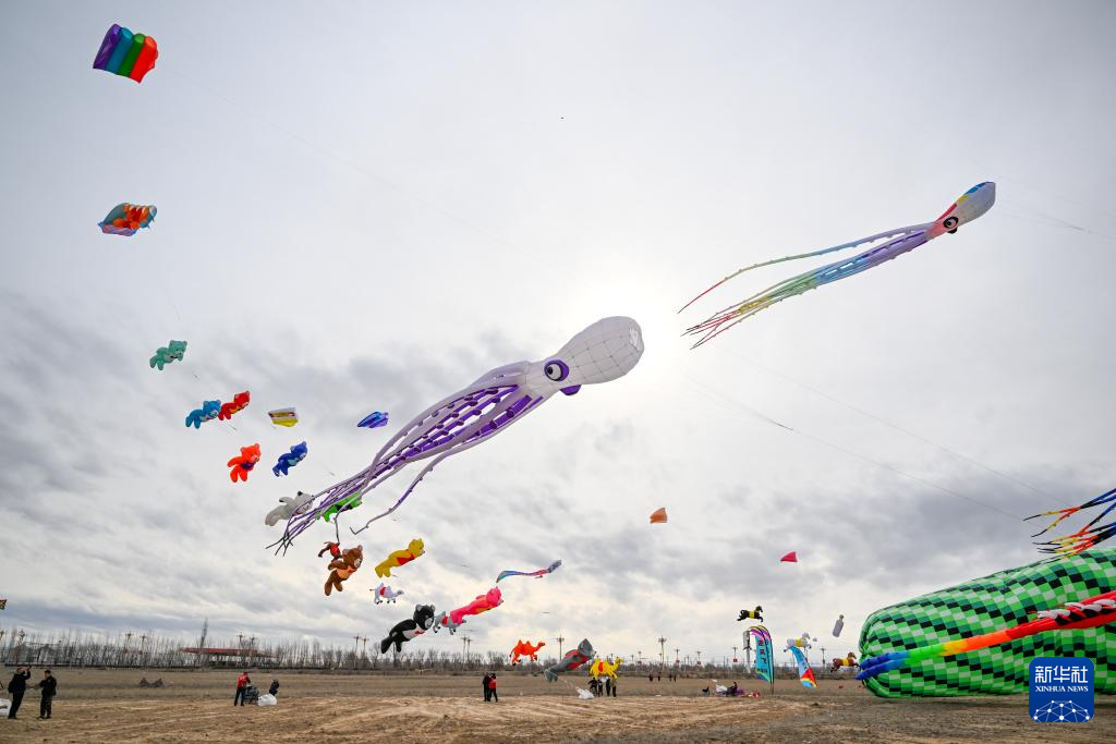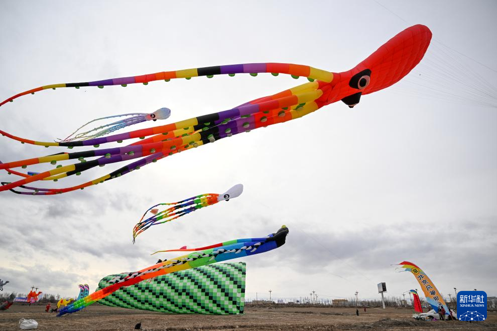 這是3月8日在新疆都拉塔口岸房車露營基地拍攝的風箏表演。
