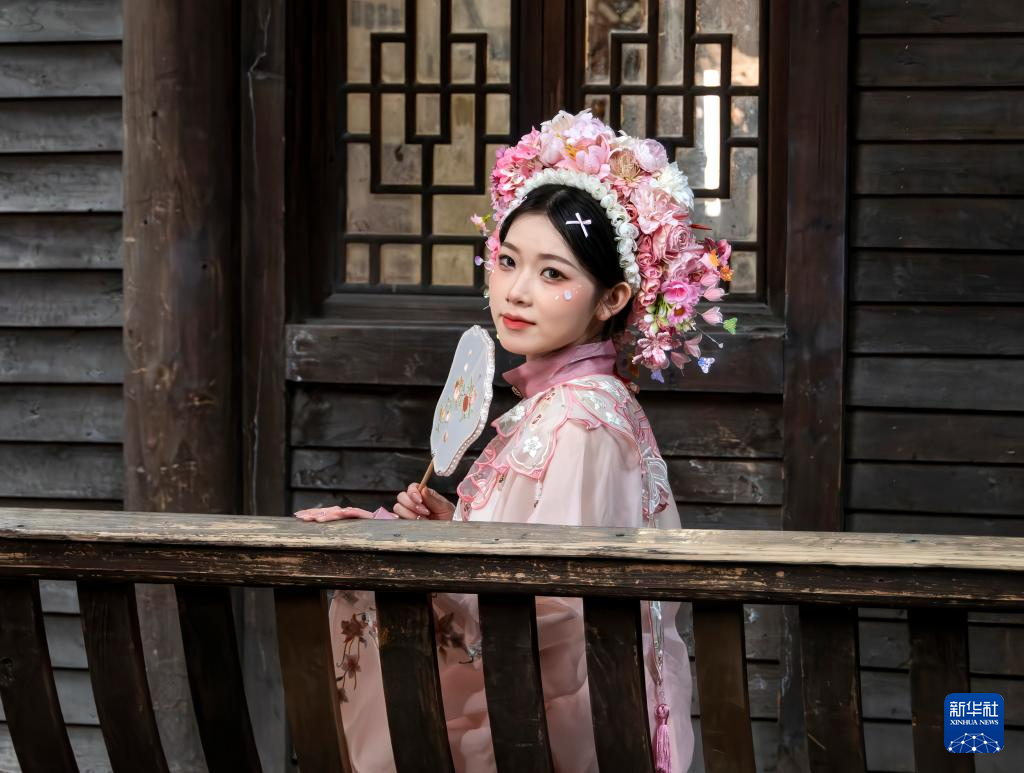 一名游客頭戴“簪花”在福州市千年古街三坊七巷里打卡留影(2月3日攝)。