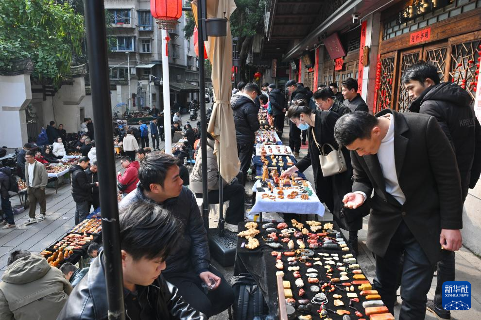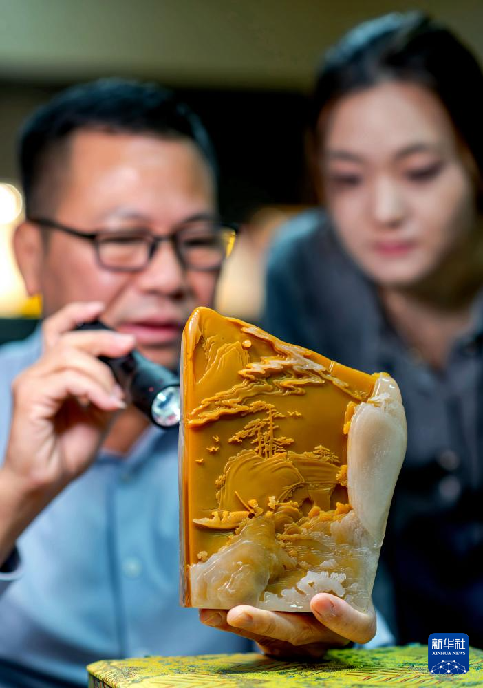 3月8日,壽山石愛好者在福州藏天園壽山石交易市場選購壽山石。