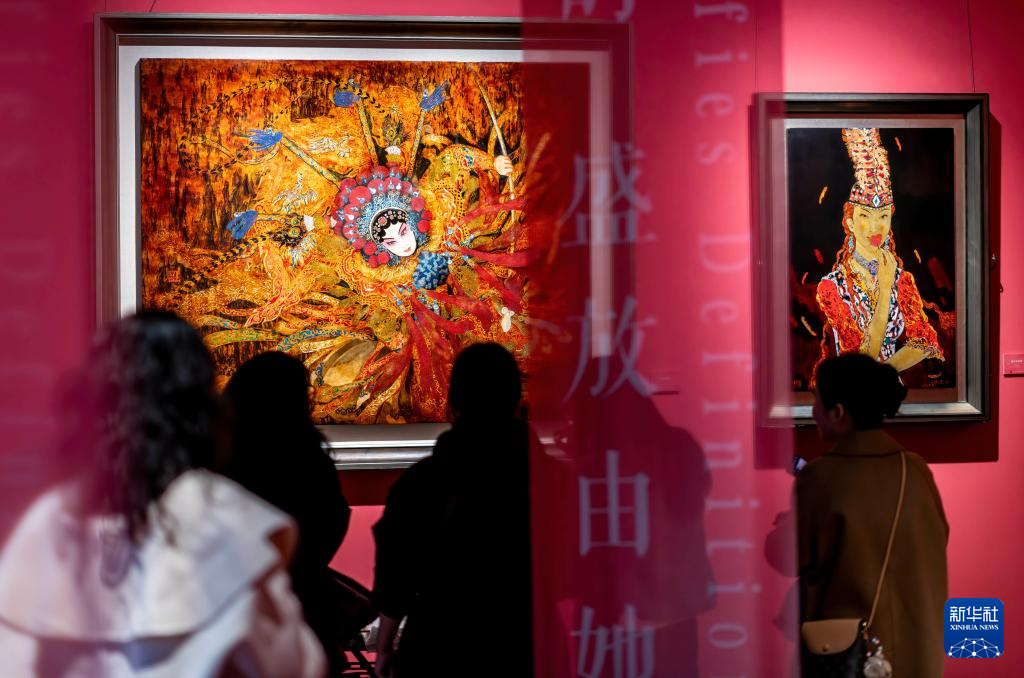 觀眾在福建省沈紹安漆藝博物館里觀賞女性題材的漆畫作品(3月7日攝)。