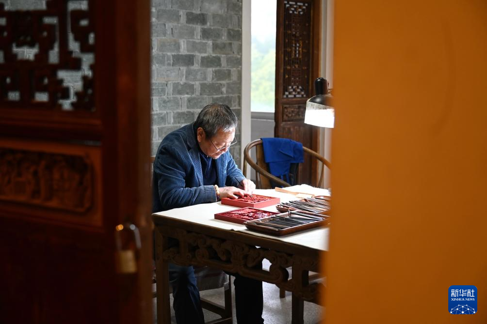 3月4日,中國工藝美術大師袁師永在進行雕漆創作。