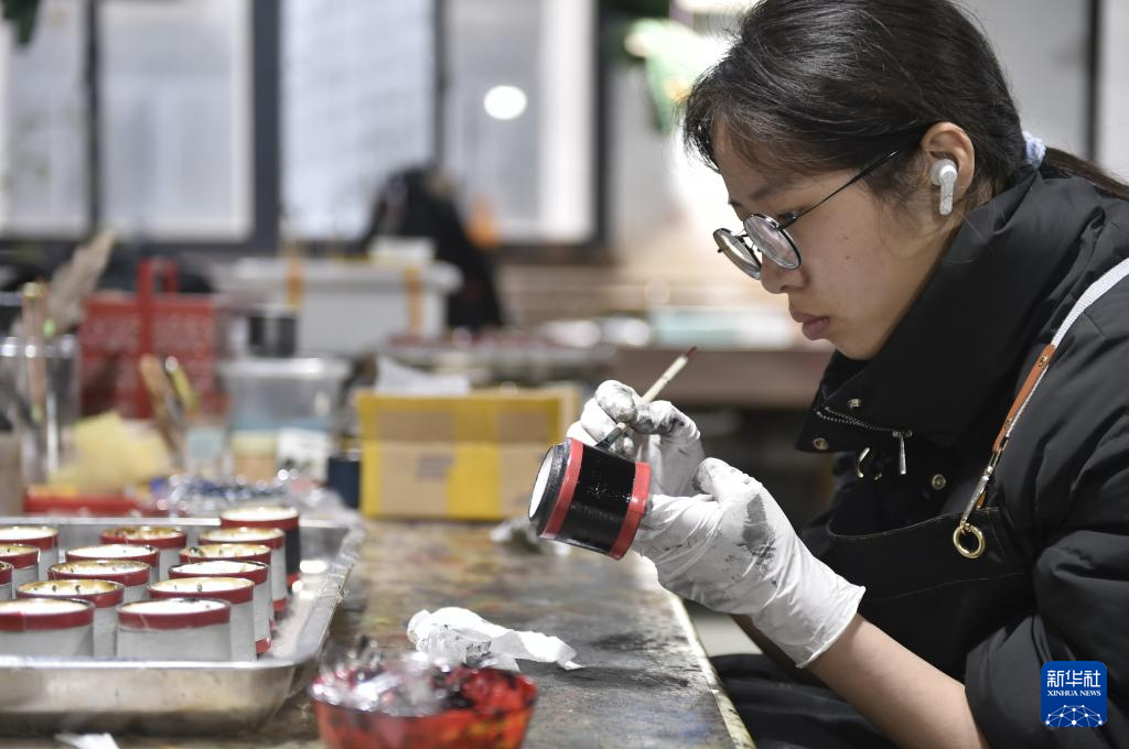3月6日,在福州漆研堂文化傳播有限公司生產車間,工作人員在制作漆藝茶具產品。
