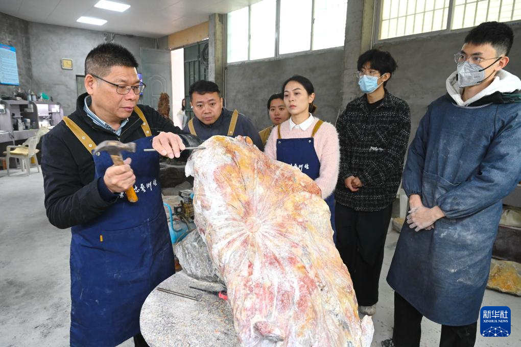 在福建省工藝美術大樓壽山石雕刻工作室,中國工藝美術大師鄭則評(左)在指導學生進行壽山石雕刻創作(3月6日攝)。