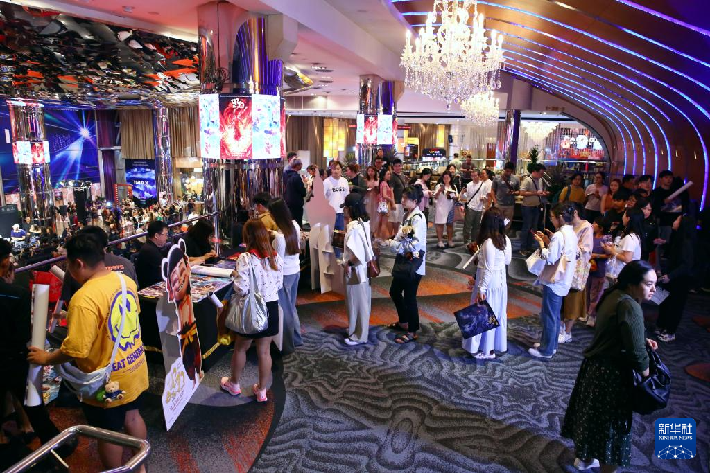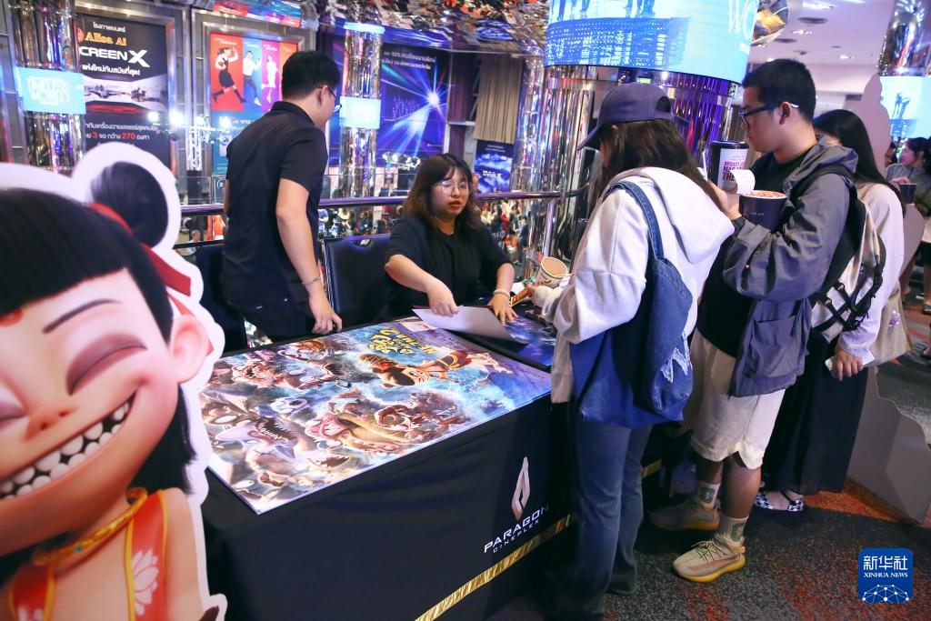 3月12日,在泰國曼谷暹羅百麗宮,參加《哪吒2》首映活動的觀眾排隊領取電影海報。