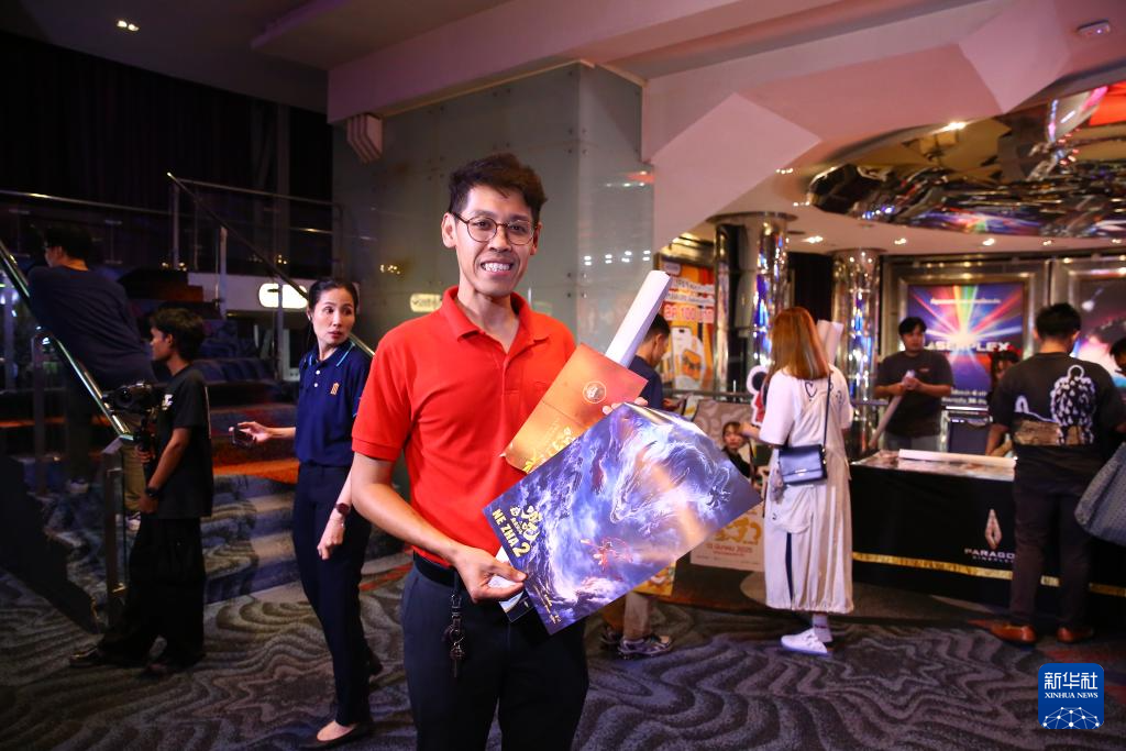 3月12日,在泰國曼谷暹羅百麗宮,參加《哪吒2》首映活動的大學教師差瓦立向記者展示他領取的海報。