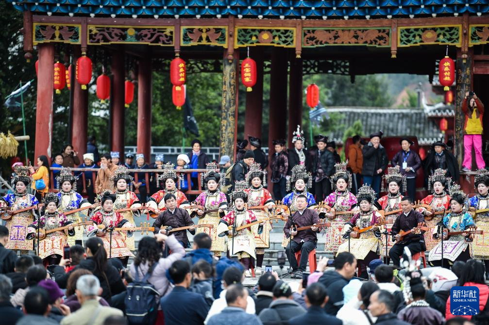 3月15日,在貴州省榕江縣三寶侗寨,參加“薩瑪節”活動的群眾在彈唱侗族琵琶歌。