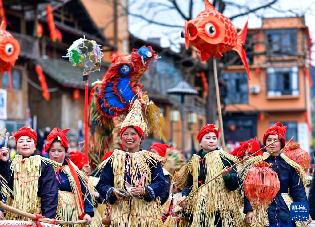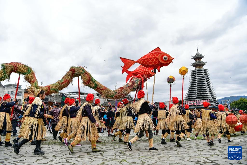 3月15日,當地群眾在貴州省榕江縣三寶侗寨“薩瑪節”活動中舞稻草龍。