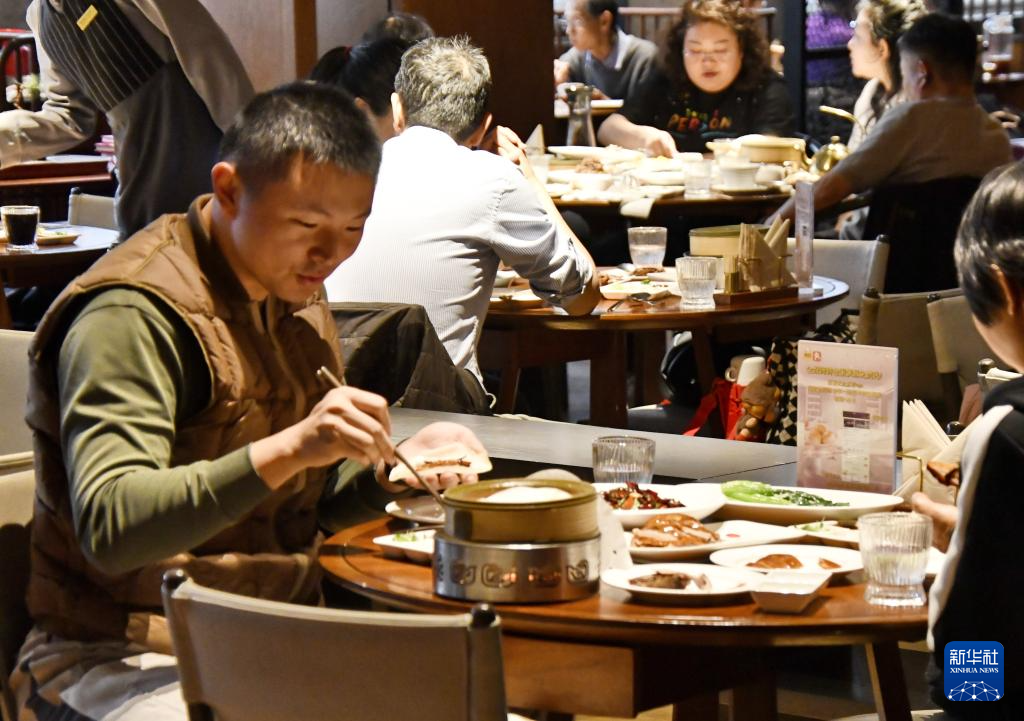 顧客在全聚德烤鴨店和平門總店品嘗掛爐烤鴨(3月13日攝)。