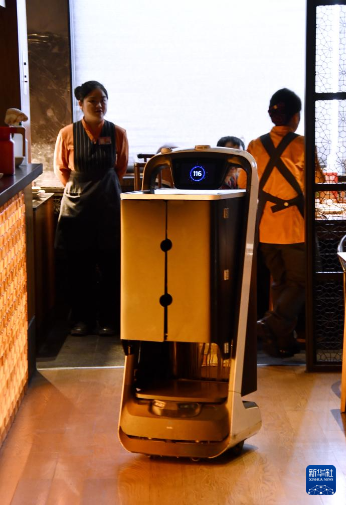 在全聚德烤鴨店和平門總店拍攝的送餐機器人(3月13日攝)。