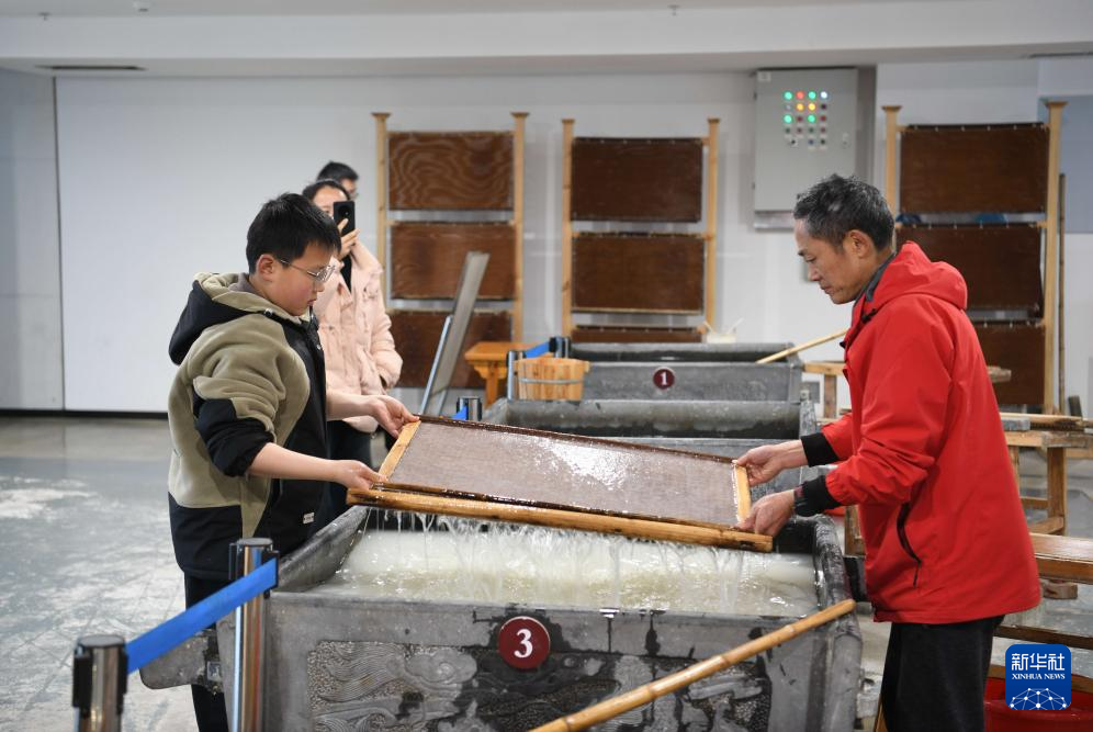 3月15日,游客在涇縣宣紙文化園體驗宣紙撈紙工藝。