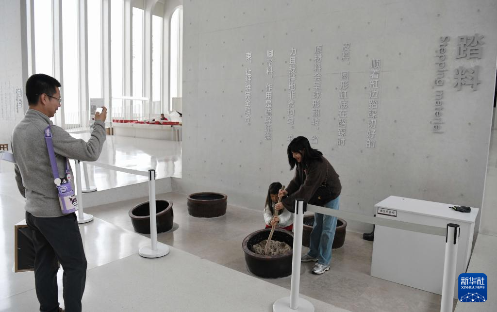 3月15日,游客在涇縣宣紙文化園體驗宣紙踏料工藝。