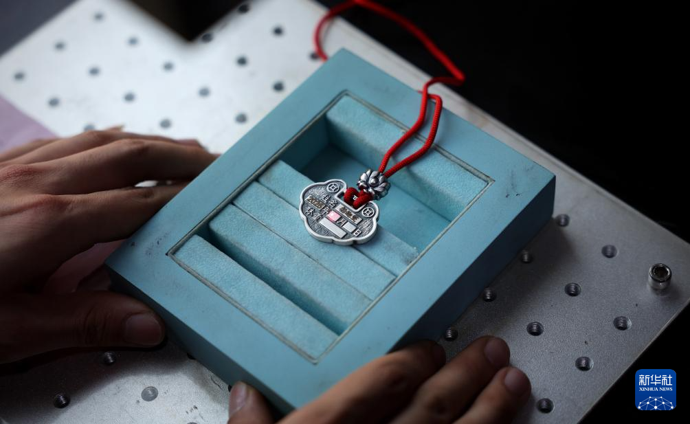 3月13日,孫朋在顧客訂做的長命鎖上用激光雕刻信息。