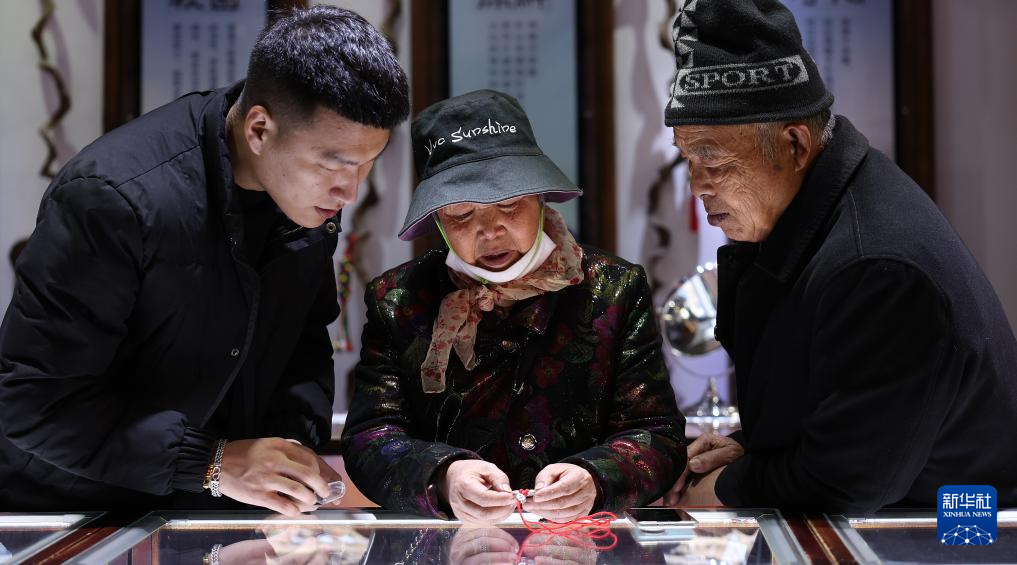 3月13日,孫朋(左)為一對老年顧客介紹銀飾。