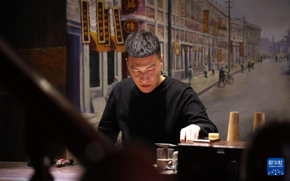 在遼寧省營口市遼河老街百年建筑老世興銀樓工坊里,作為遼寧省非遺代表性項目老世興金銀制作技藝第六代傳承人的孫朋,忙著對銀飾進行鏨刻加工。