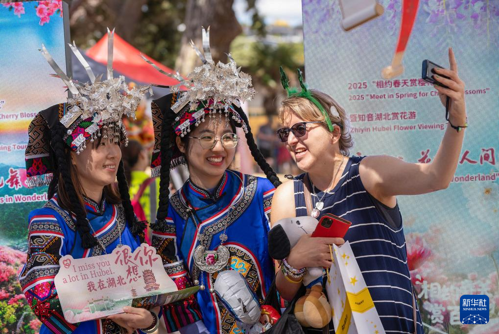 3月16日,在新西蘭奧克蘭舉行的新西蘭中國兒童文化日活動上,一名游客與身穿中國少數民族傳統服飾的工作人員合影。