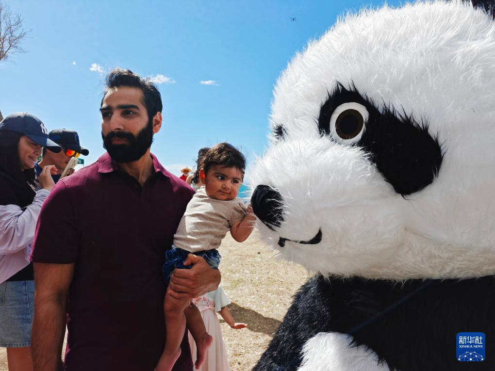 3月16日,一名兒童在新西蘭奧克蘭舉行的新西蘭中國兒童文化日活動上與大熊貓人偶互動。
