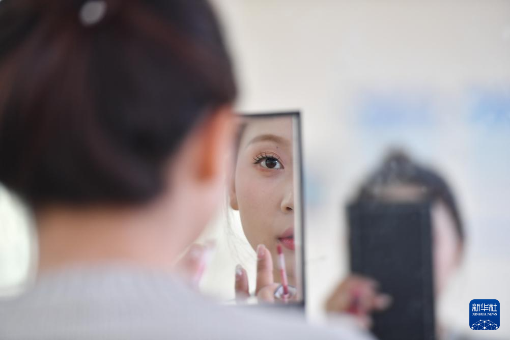 3月17日,常德絲弦藝術劇院的一名“90后”演員在演出前化妝。