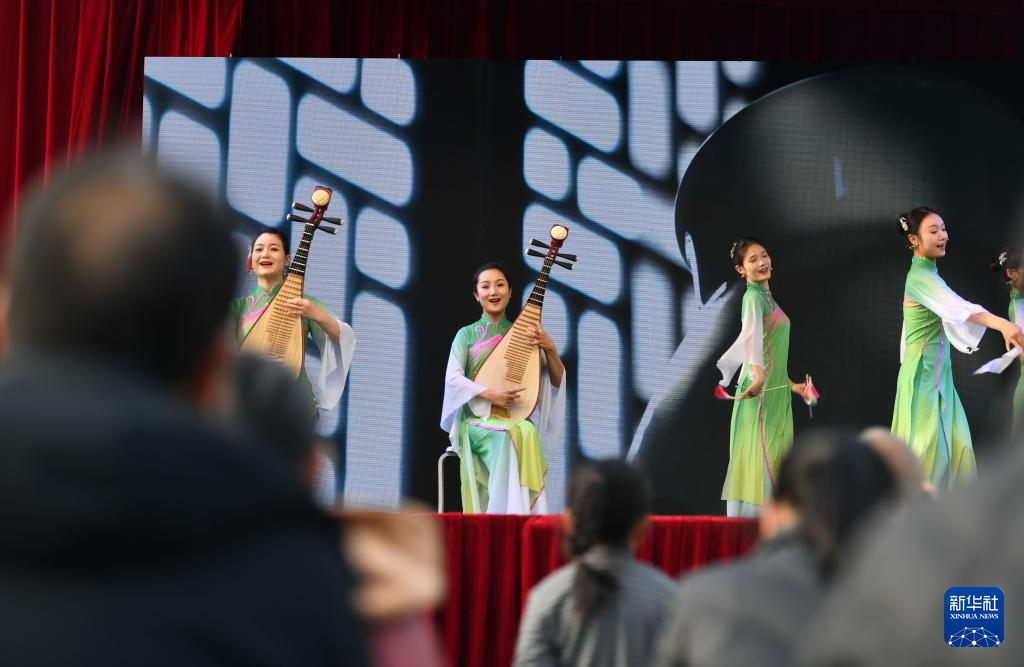 3月18日,“80后”的常德絲弦青年傳承人伍恩禹(臺上左二)在惠民演出中。