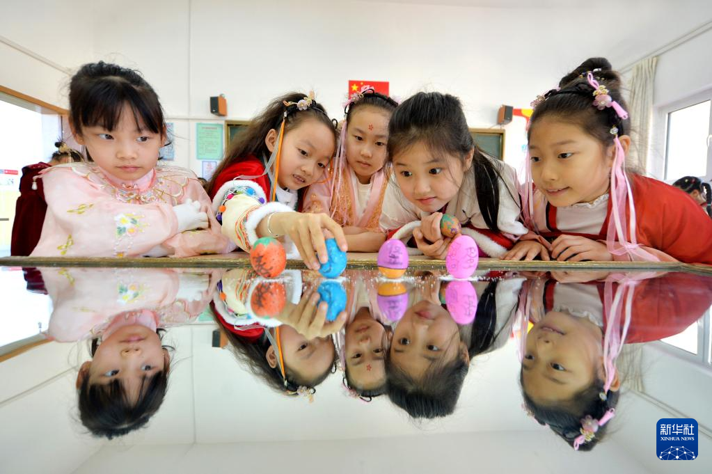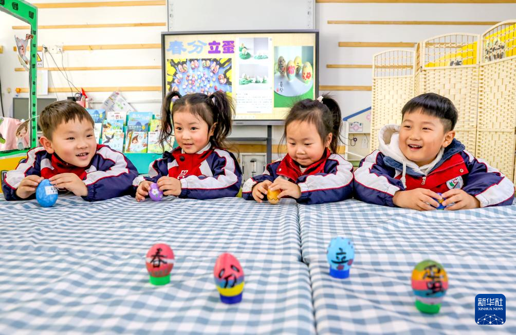 3月20日,在江蘇省揚州市江都區育才幼兒園,小朋友們體驗“立蛋”習俗。