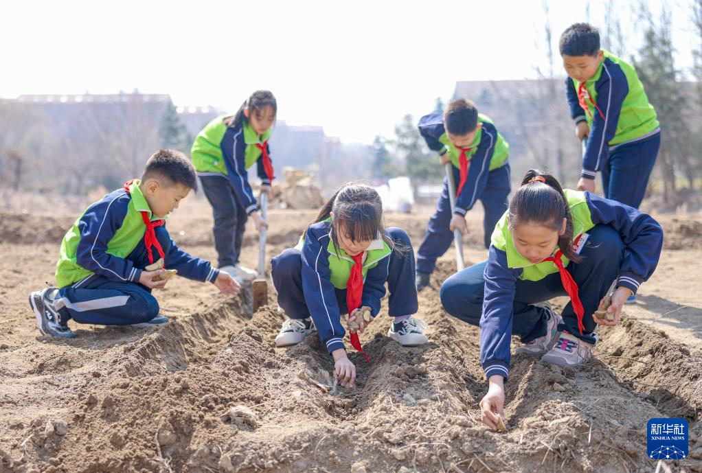 3月20日,在山東省榮成市府新小學勞動實踐基地,學生們在菜園里種土豆。