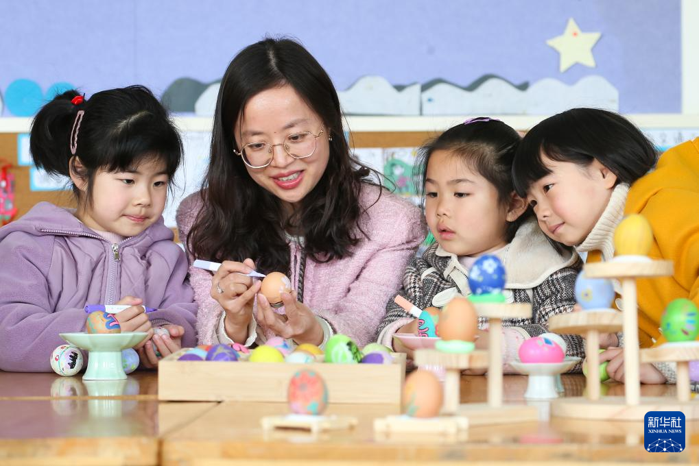 3月20日,在江蘇省句容市郭莊鎮葛村中心幼兒園,老師指導小朋友繪制彩蛋。