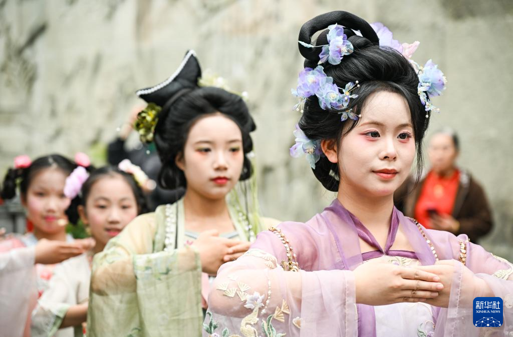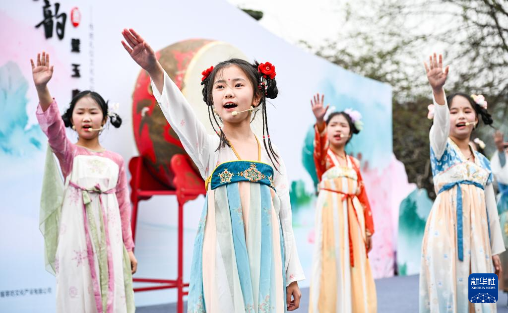 3月22日,小朋友在重慶璧山“儒雅璧韻·璧玉唐禮”傳統文化禮儀展示活動現場表演歌舞。