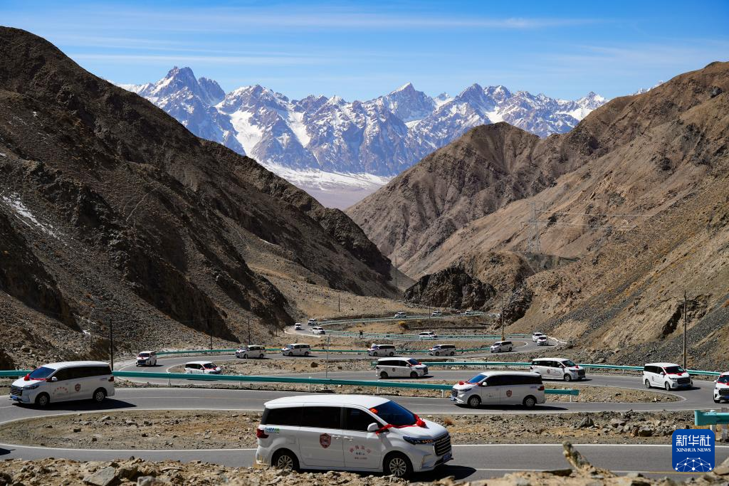 3月22日,在新疆塔什庫爾干塔吉克自治縣,參加“盤龍古道”恢復通車儀式的車隊在行進中?!氨P龍古道”在冬季封鎖,春季恢復通車,當地豐富的文化活動吸引大量游客前來,使得“盤龍古道”近年來成為熱門的旅游線路。
