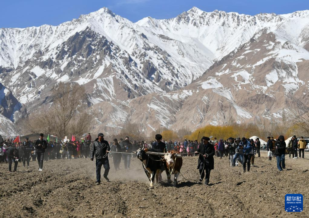在新疆塔什庫爾干塔吉克自治縣“彩云人家”民俗村,村民為游客表演傳統農業生產中的犁地方式——“二牛抬杠”(3月22日攝)。