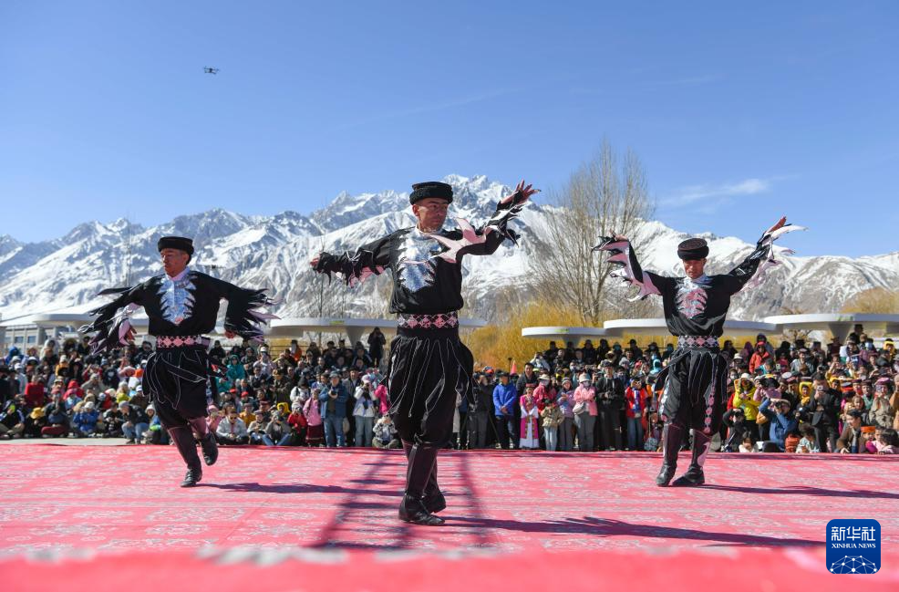 在新疆塔什庫爾干塔吉克自治縣提孜那甫鄉賽馬場,參與非遺展演的村民在跳舞(3月23日攝)。