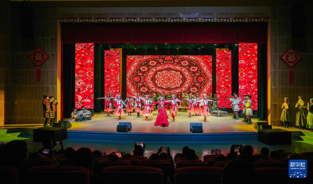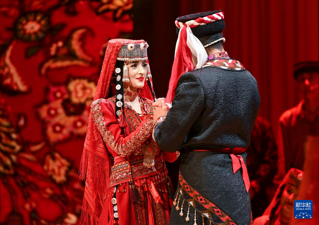 3月22日,在新疆塔什庫爾干塔吉克自治縣蔥嶺演藝中心,音樂劇演員表演非物質文化遺產塔吉克族婚俗舞蹈。